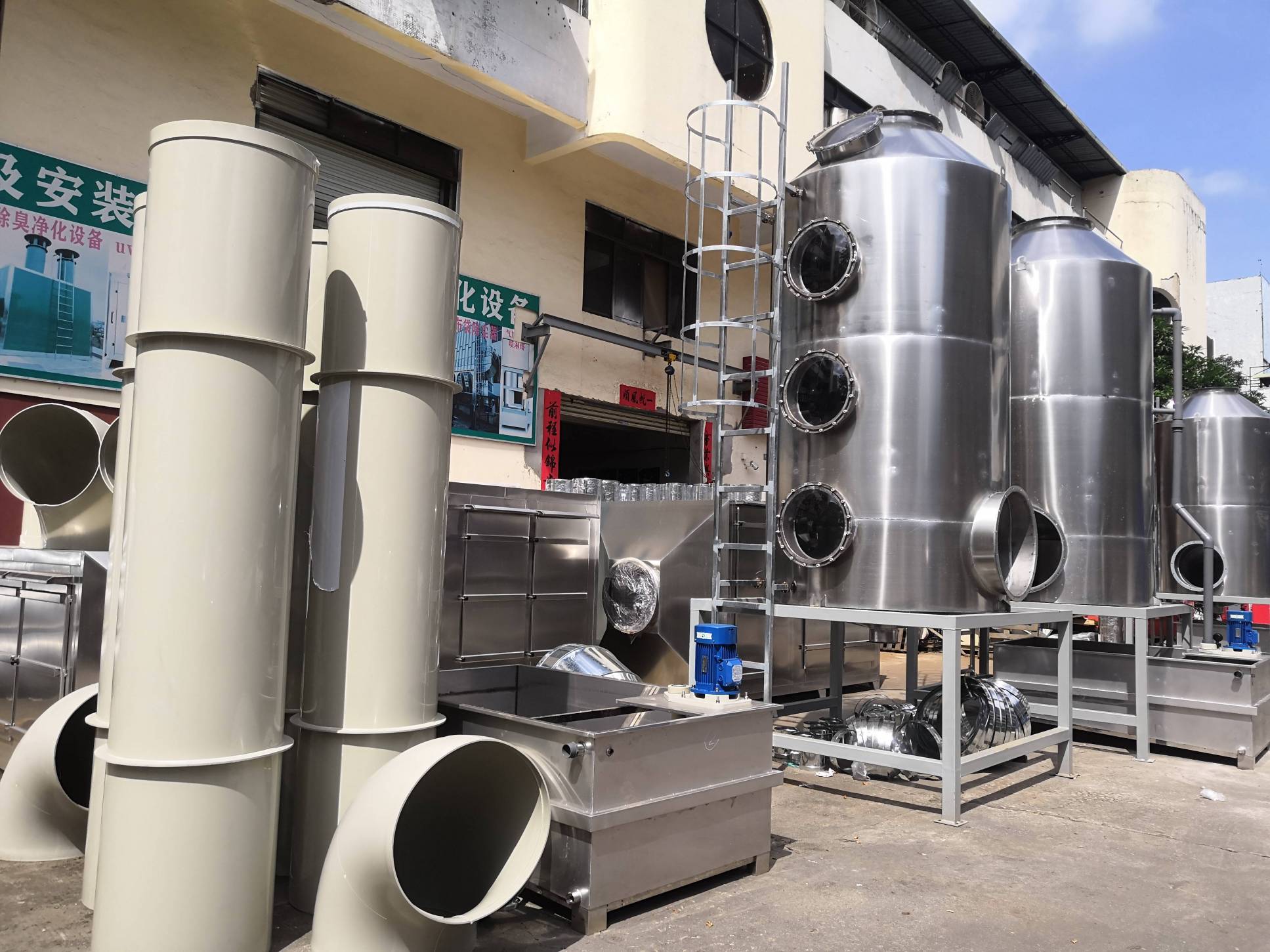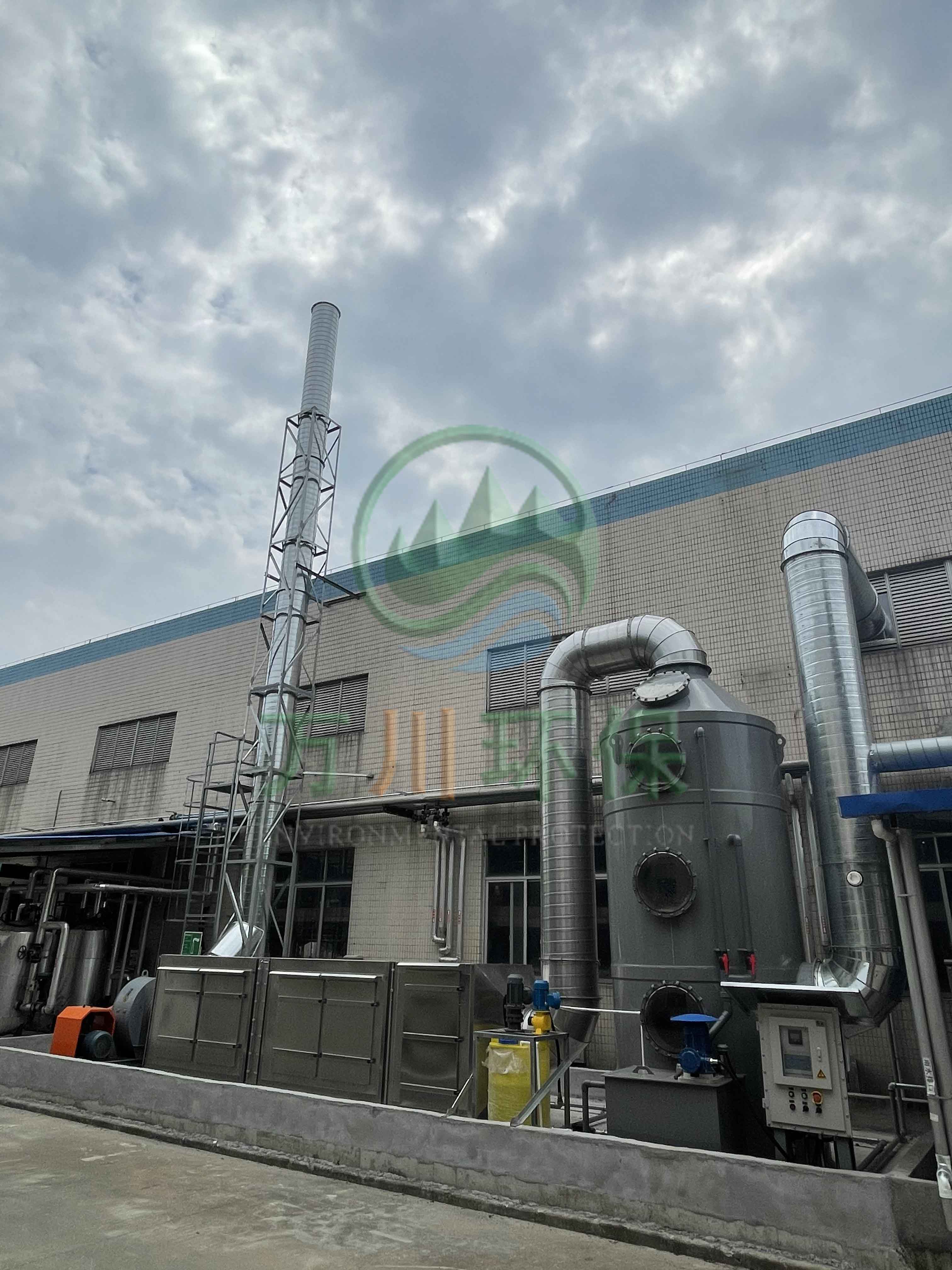 根據廢氣類型和場地需求我們采用噴淋塔+兩級活性炭對其進行處理。反應釜廢氣處理配套一臺17170風量pp噴淋塔+兩臺17170風量的不銹鋼材質活性炭吸附塔+干式過濾與大功率防爆離心風機+自動化電控柜系統。